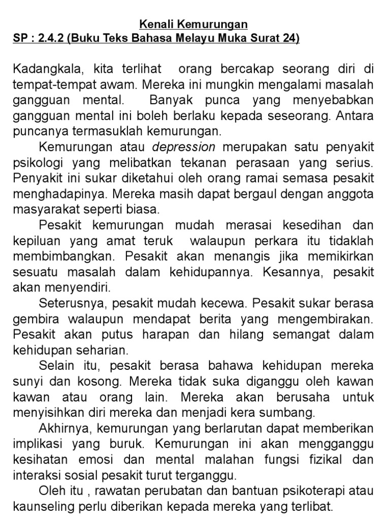 Dalam beberapa kes kemurungan mungkin berkaitan dengan masalah kesihatan fizikal yang tidak didiagnosis. Contoh Karangan SPM Cara Memupuk Semangat kejiranan. Tahap toleransi anda rendah dan mudah marah walaupun disebabkan oleh perkara kecil.